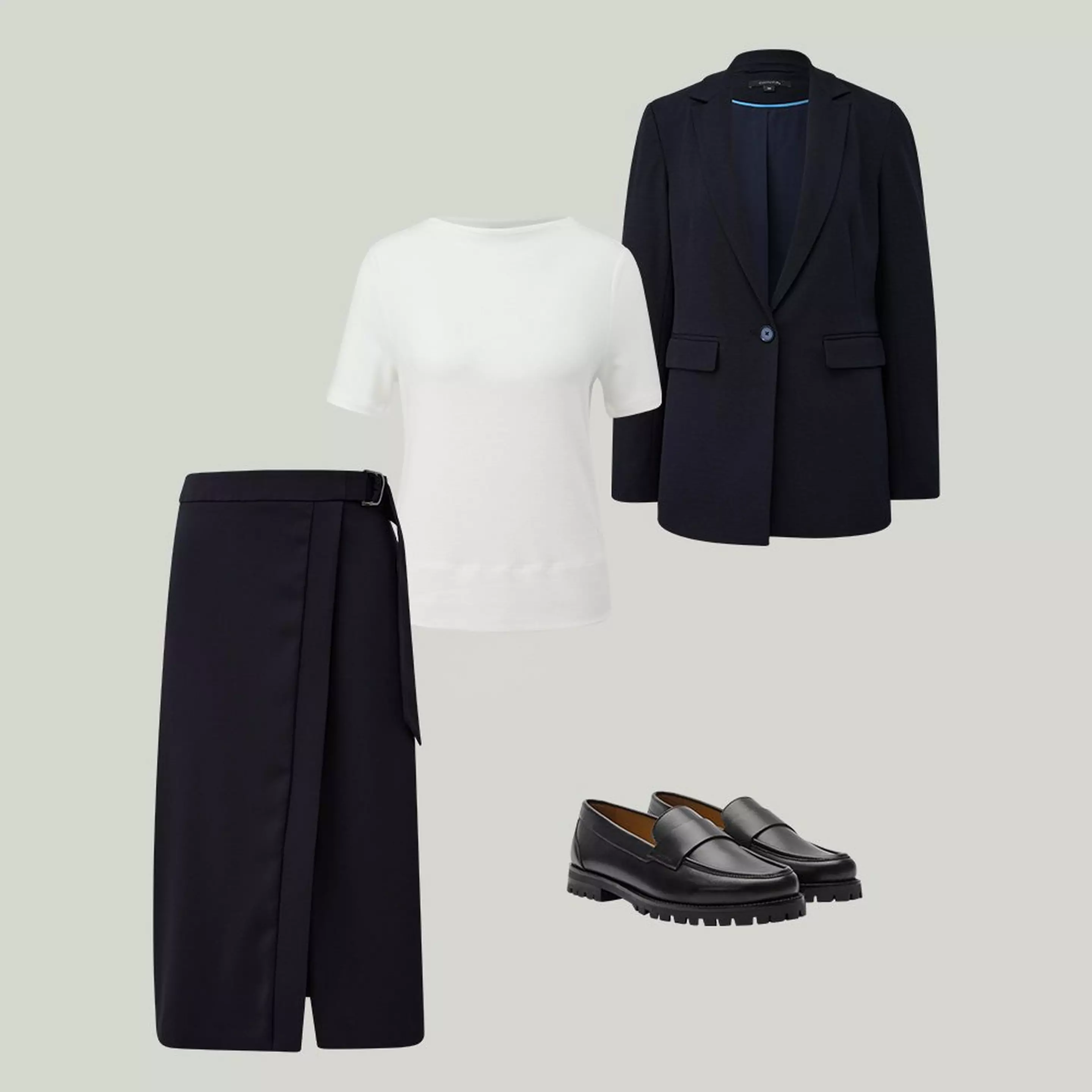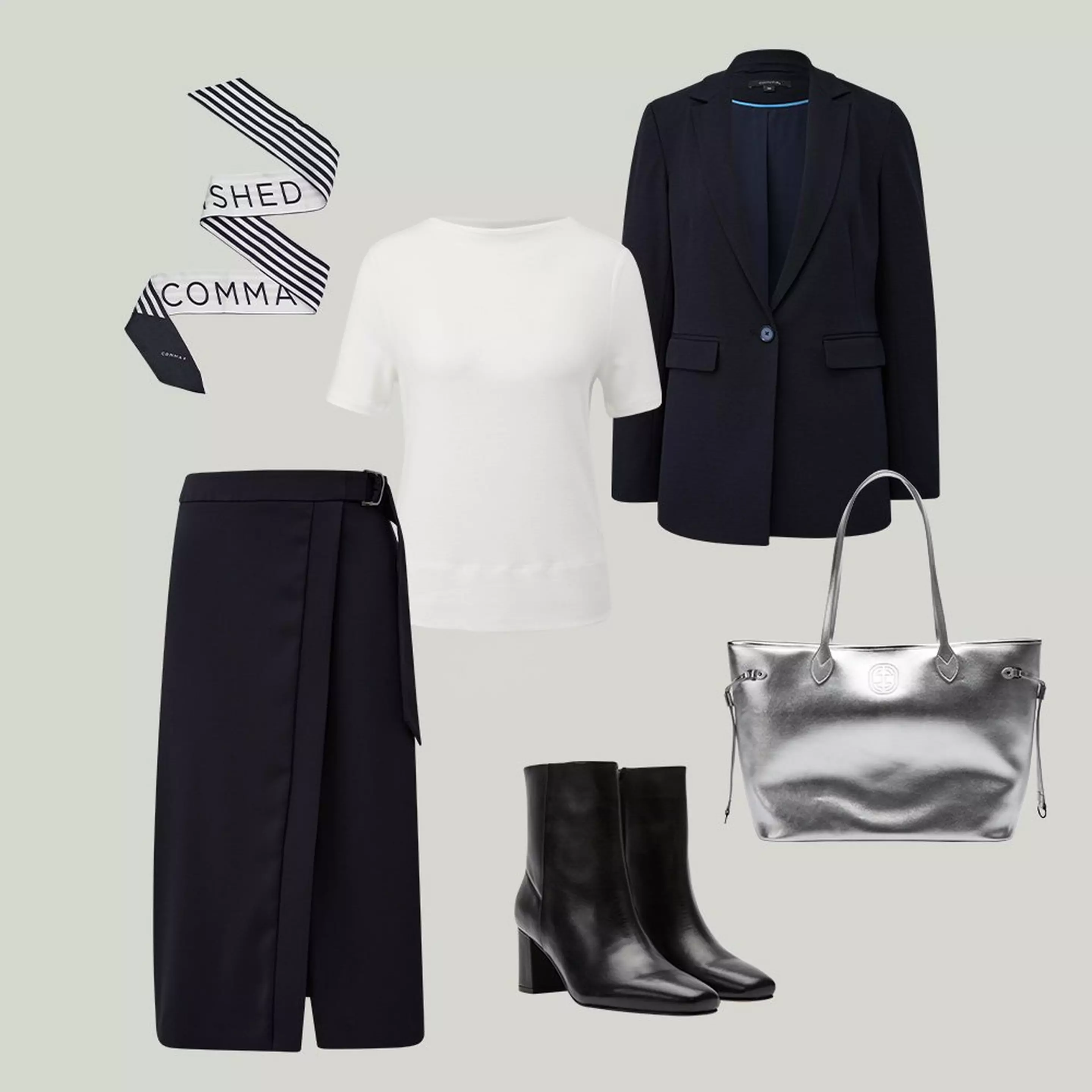 Tauschen Sie Loafer gegen Ankle-Boots und Business-Bag gegen einen coolen Shopper und kombinieren Sie einen eleganten Seidenschal dazu – und Ihr Look ist bereit für den Abend.