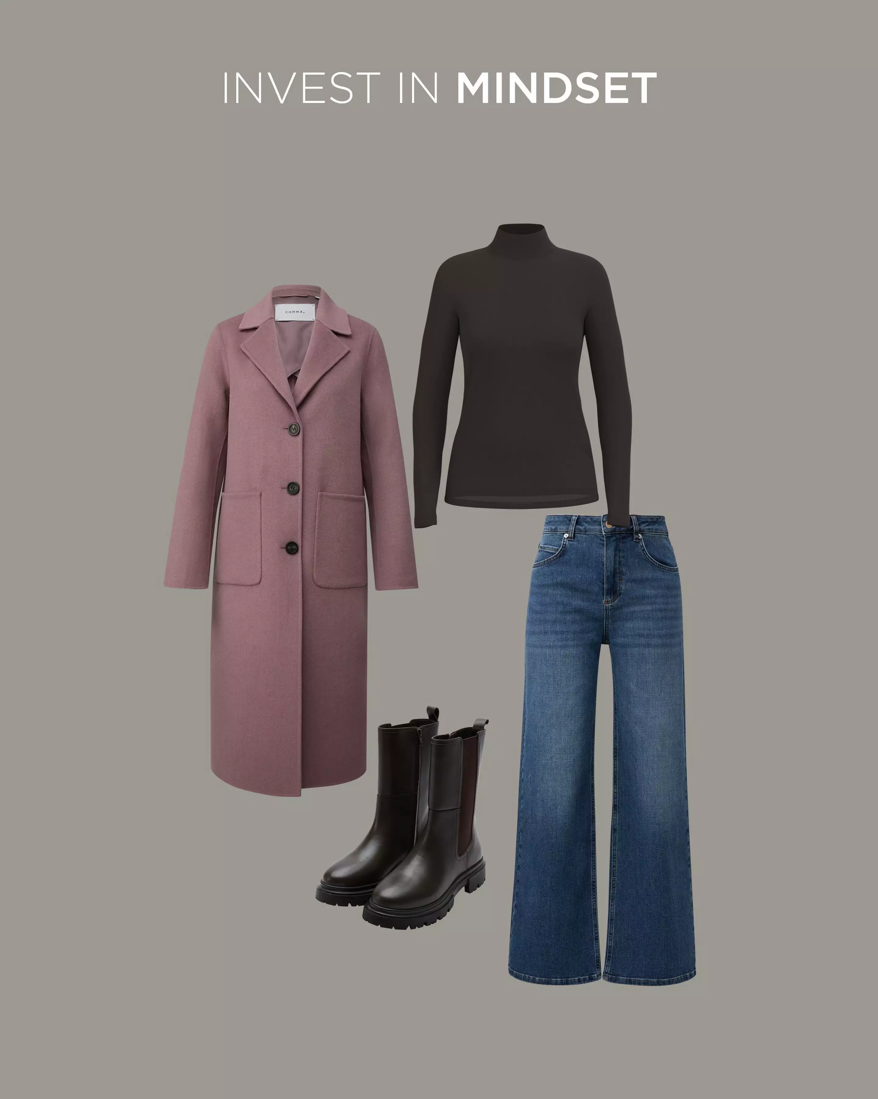 Neue Routinen, klarer Fokus, Haltung im Alltag. Wide-Leg Denim und Soft Knit bringen Ease, der Mantel in Soft Colour Ruhe. Ein Look, der Selbst- und Weiterentwicklung begleitet.