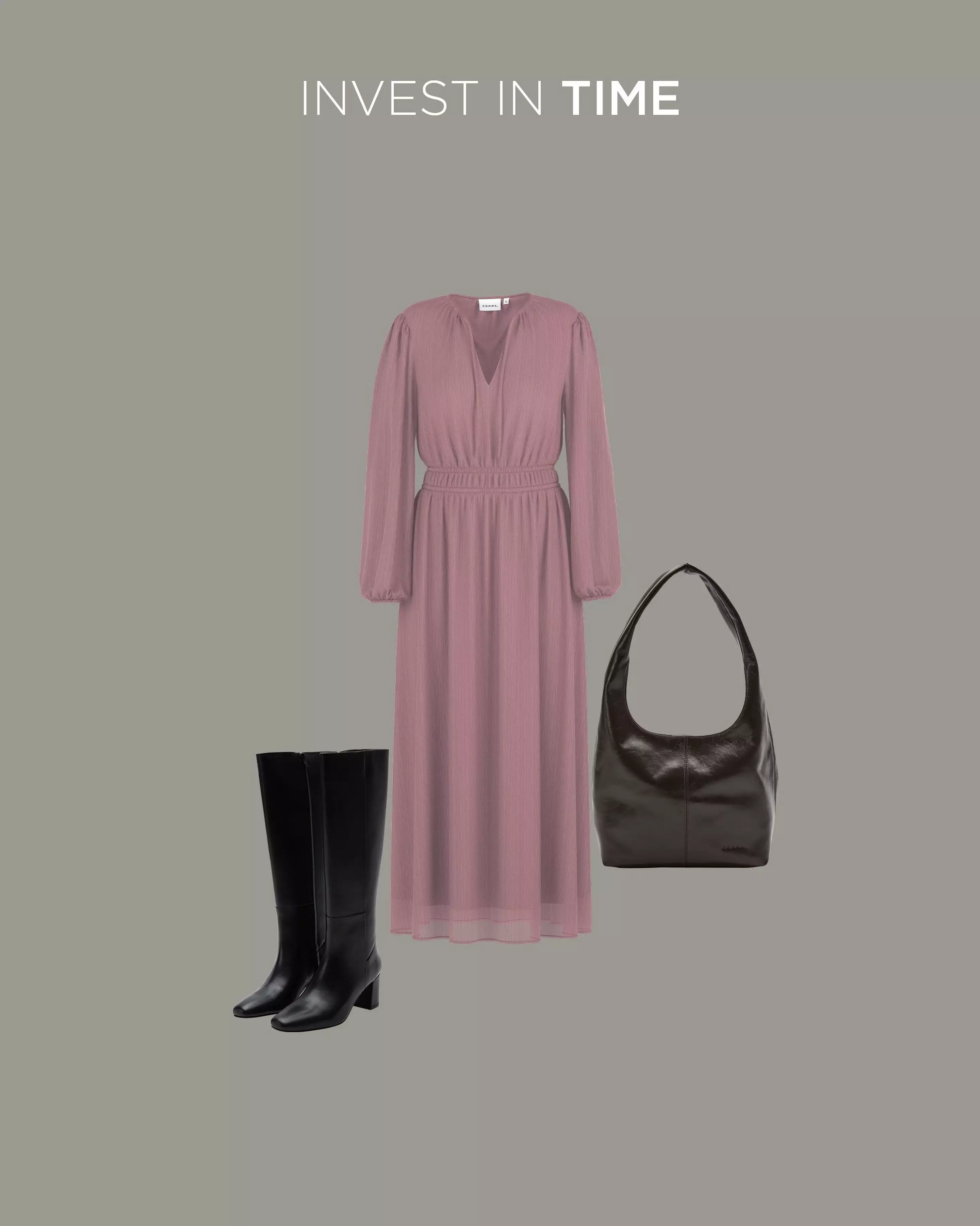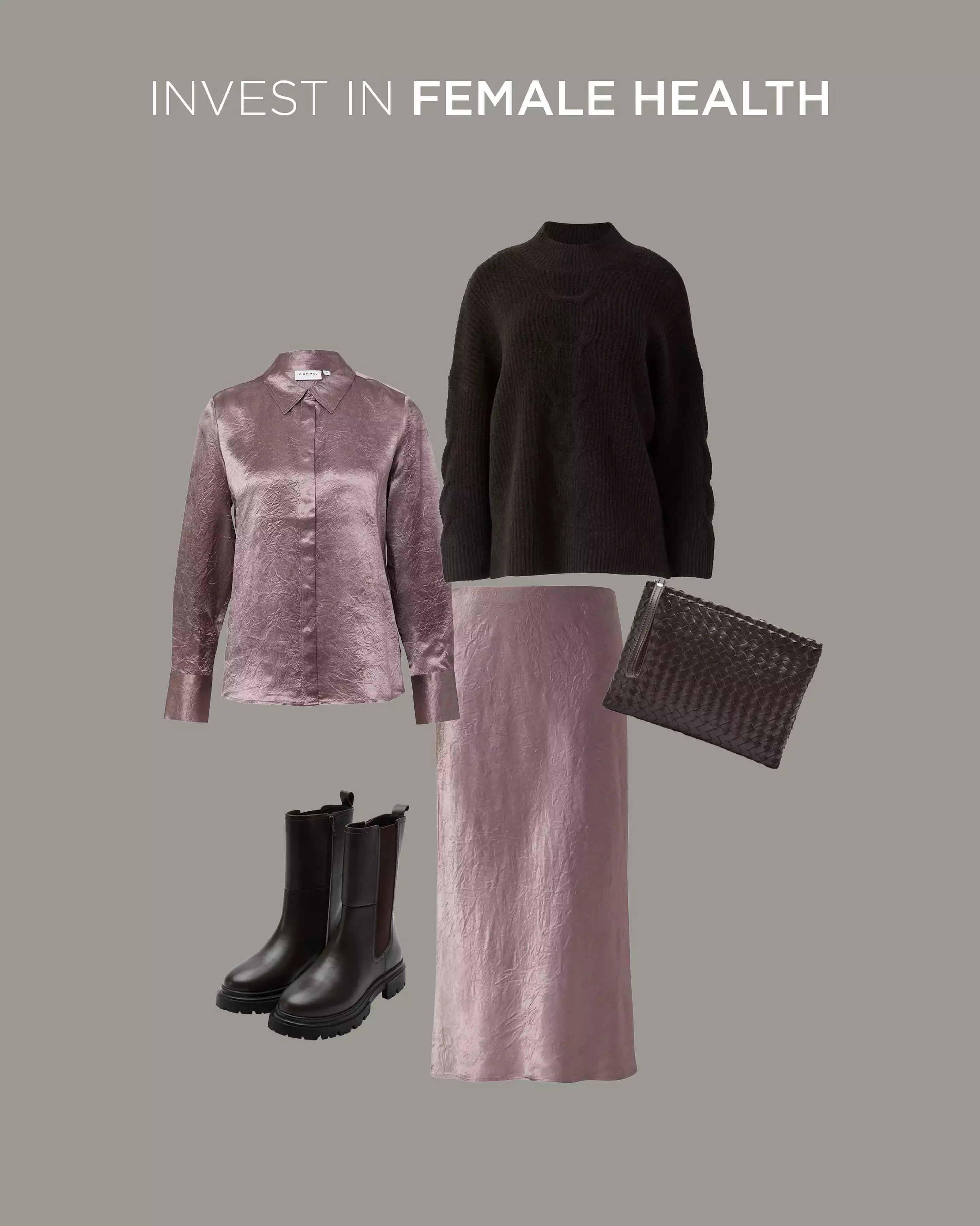 Self-Care beginnt mit Pieces, die Komfort und Stärke vereinen: fließende Satin-Texturen, die Leichtigkeit geben. Soft Knit für Wärme und Cosiness. Ergänzt mit Boots und einer cleanen Tasche entsteht ein Look, der Selbst-Fürsorge und Präsenz verbindet.